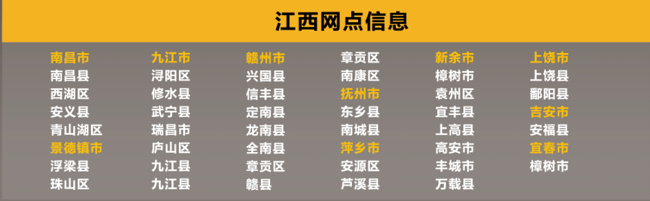 江西全网覆盖南昌、景德镇、九江、赣州、抚州、萍乡、新余、上饶、吉安、宜春10个市区,加上密集的支线网络,上至县市,下至乡镇,将实现省内的全面覆盖。